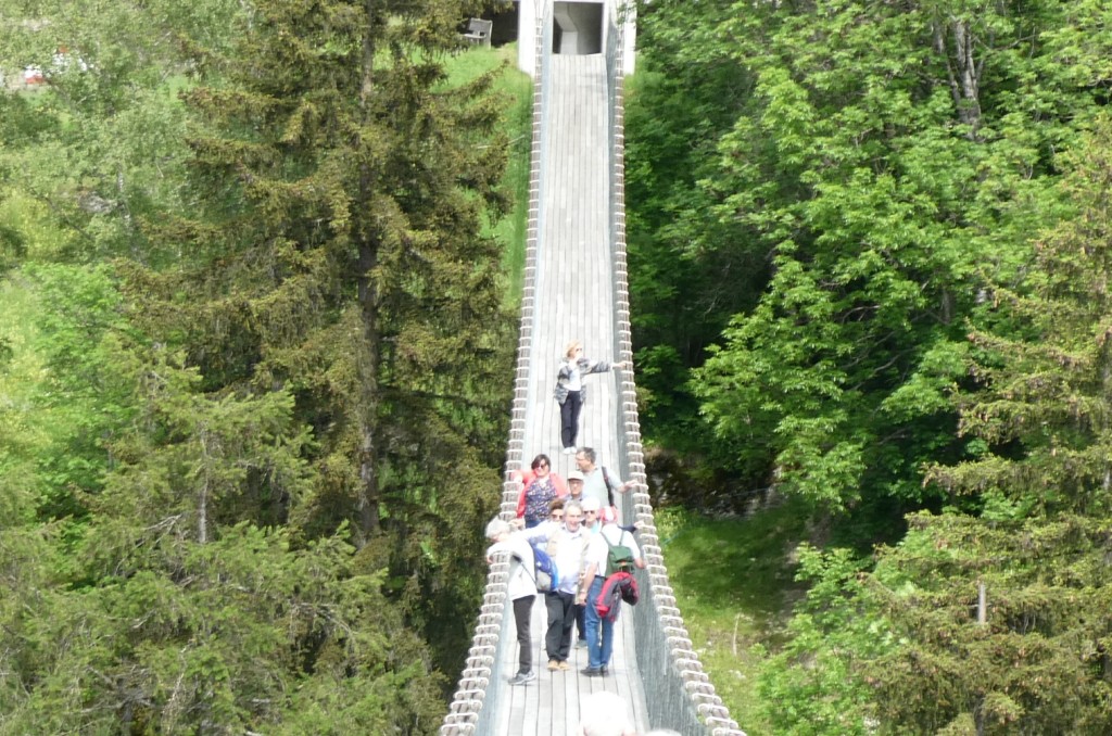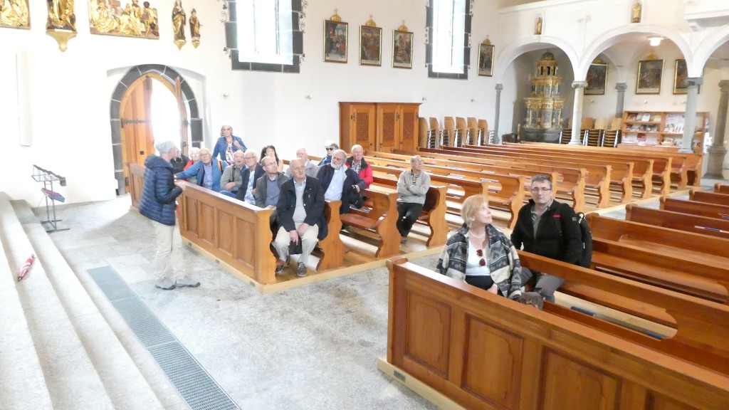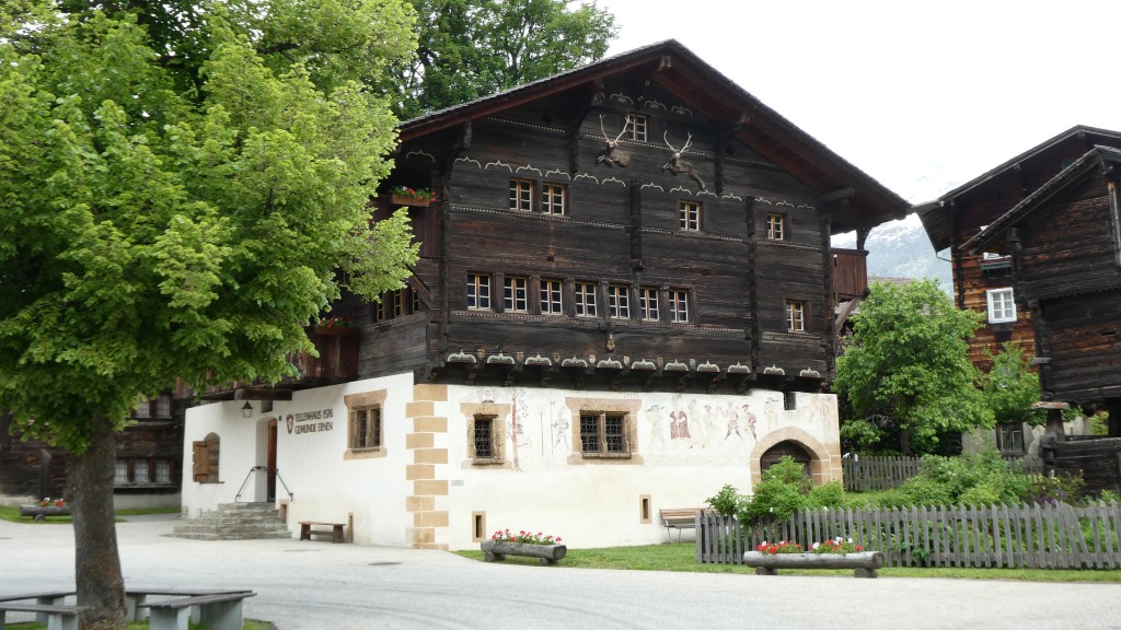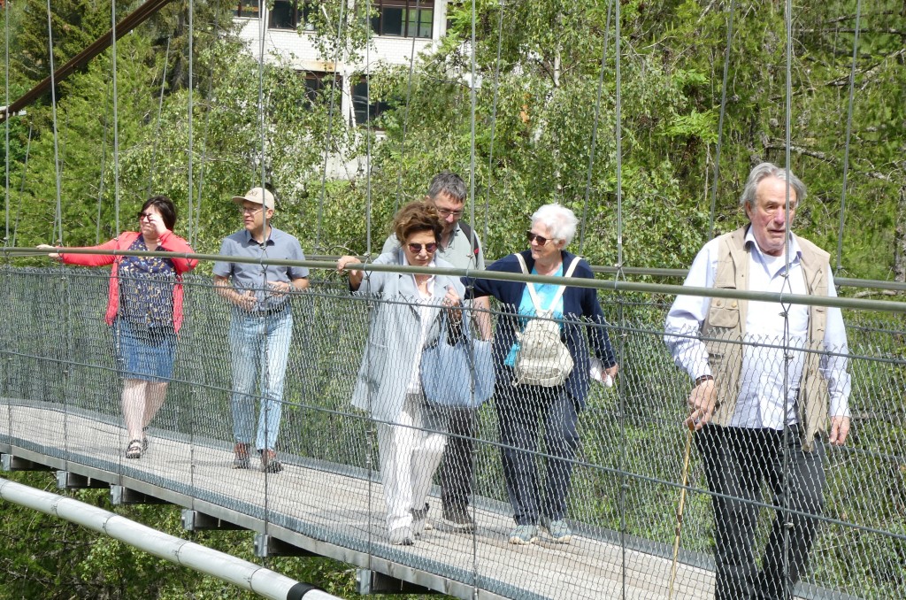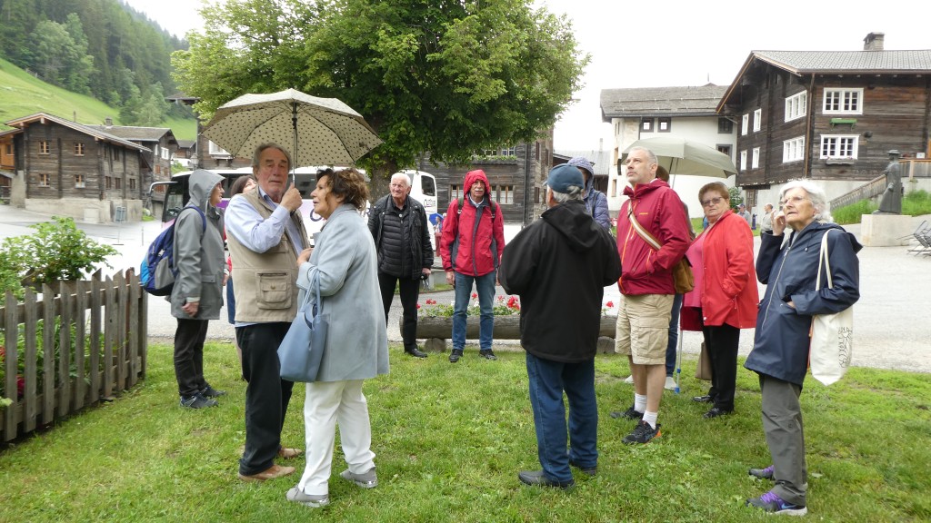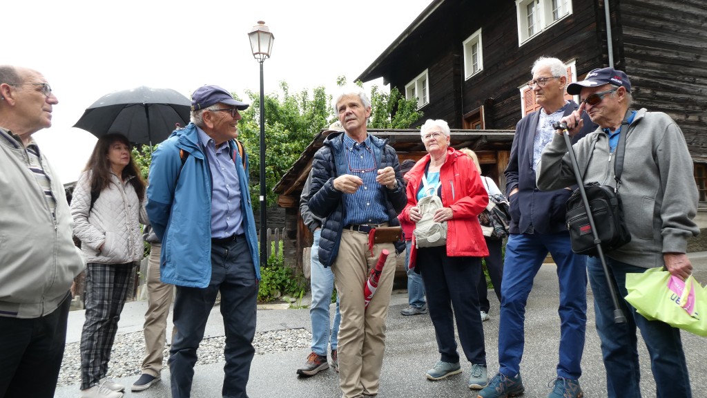 ; Notre visite a débuté par la traversée de la vallée par le « Goms Bridge ». Avec ses 280 mètres, il est un des plus longs ponts suspendus du Valais. Il enjambe la gorge de la Lama et le Rhône à 92 m de hauteur et relie les villages de Fürgangen et Mühlebach. Autrefois chef-lieu de la vallée de Conches, Ernen a profité de son emplacement comme plaque tournante du transport pendant des siècles. La construction d'une ligne routière et ferroviaire moderne de l'autre côté de la vallée du Rhône met la ville à l'écart en termes de trafic et entraîne un déclin économique. Ernen est un des villages les plus intéressants du Valais pour ses nombreuses maisons du 15ème 17ème et du 18ème siècle. Avec nos 2 guides, nous avons eu l'occasion de visiter un peu de la richesse passée de la commune. Des bâtiments remarquables comme l'église paroissiale Saint-Georges construite en 1510-18 par Ulrich Ruffiner à la place d'une église à trois absides du 11ème siècle, la Tellenhaus (1578) (administration communale) qui abrite les plus anciennes fresques telliennes de Suisse, la Kapuzinerhaus (1511), l'école (1538), la Maison Sigristen-Jost (1580) transformée en musée.